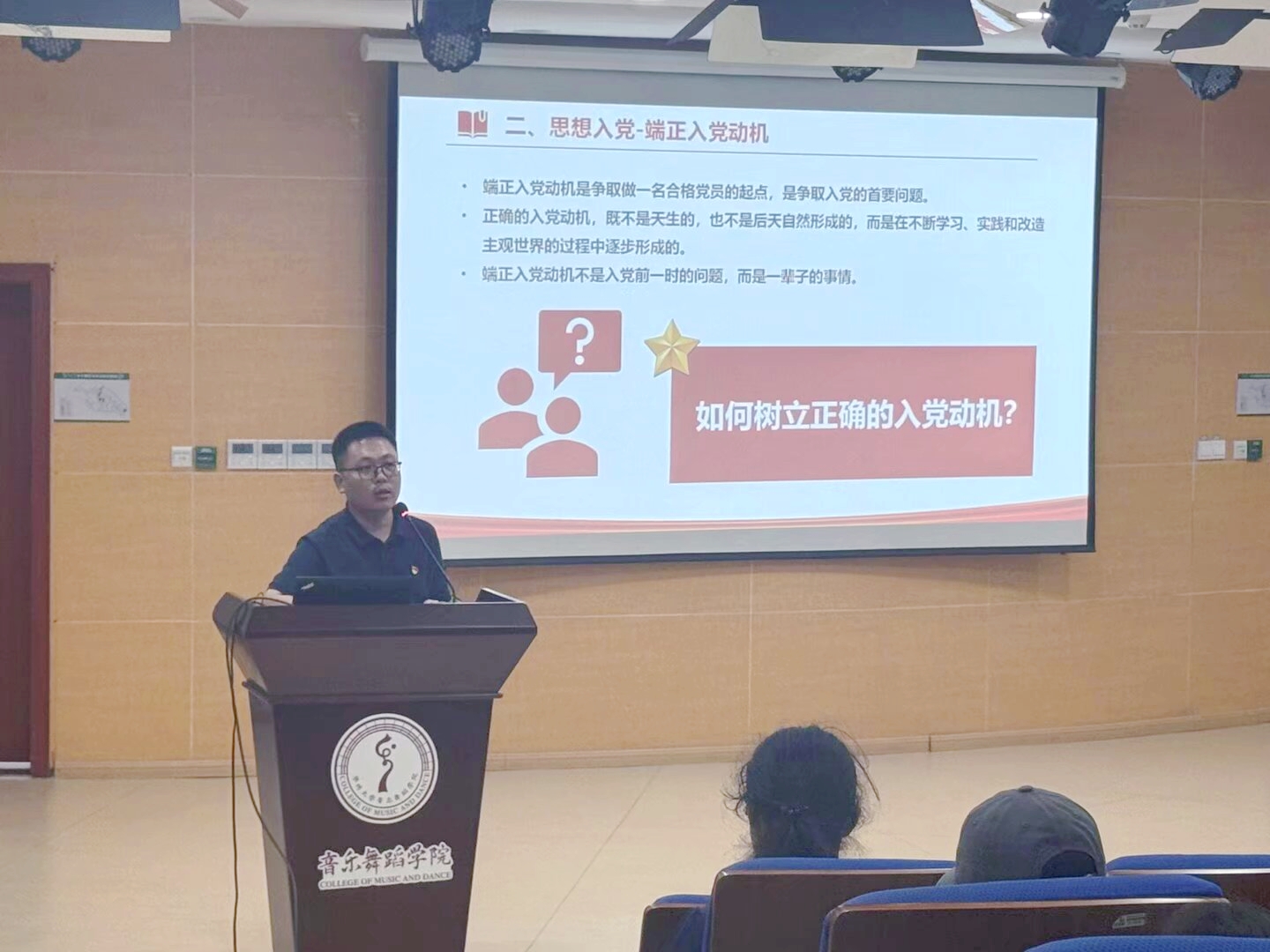 围绕“端正入党动机”这一核心问题,刘老师指出,正确的入党动机是为共产主义事业奋斗终身、全心全意为人民服务,而非追求荣誉或功利。他列举了常见错误动机,并强调端正入党动机是一辈子的事,需通过持续学习与实践锤炼党性。此外,刘老师详细解读了党员的基本条件,鼓励新生以先锋模范的标准要求自己,在学习生活中发挥带头作用。