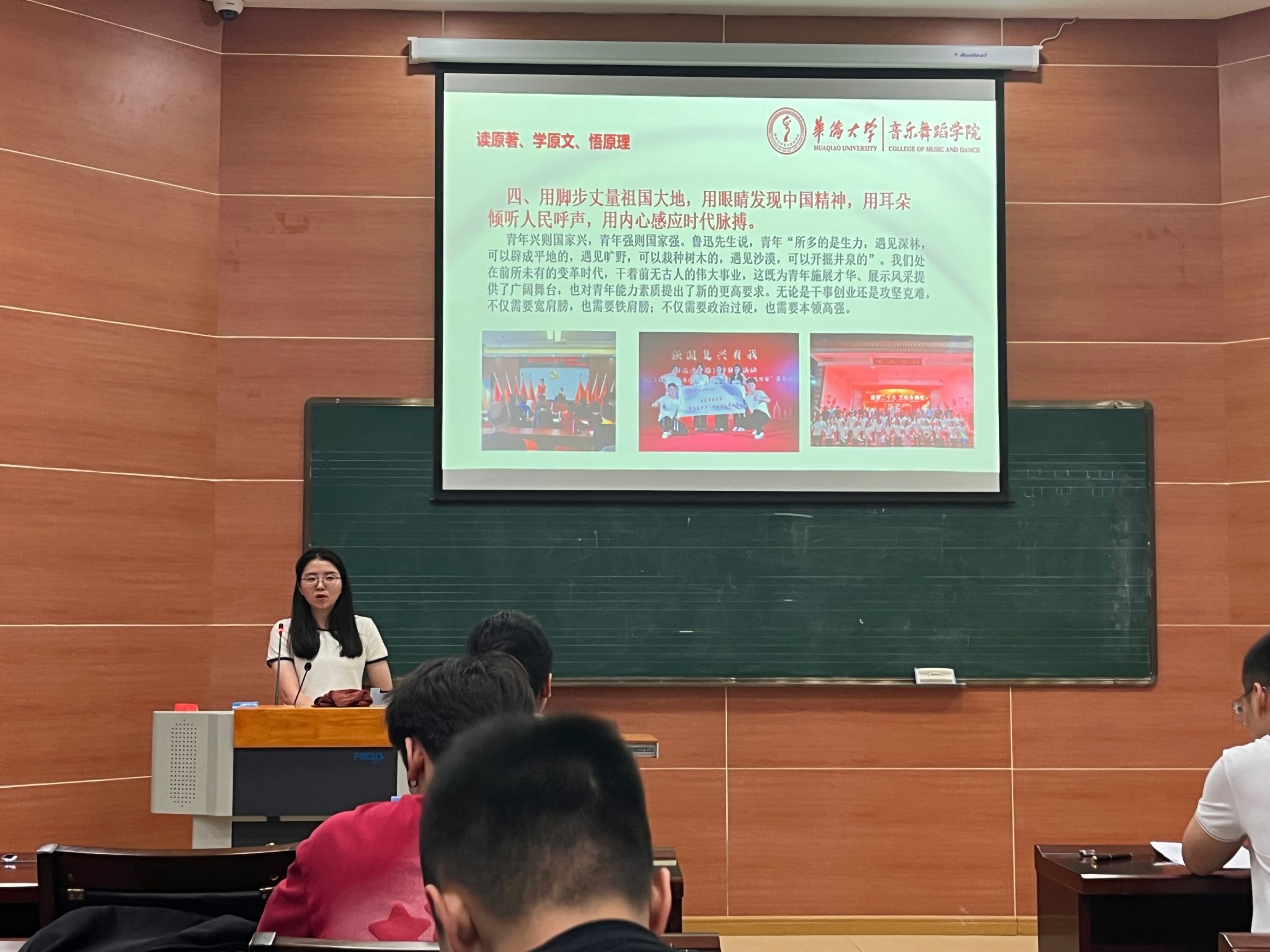 党委书记侯艳茹首先以“深入调查研究,破解发展难题”为主题,从为什么要开展主题教育、为什么要进行调查研究、怎样进行调查研究、学院从哪几个方面开展调查研究等四个方面入手,讲述了本次主题教育的重要举措以及中国共产党对调查研究工作的重视。侯艳茹书记强调:“调查研究是我们党的传家宝,是做好各项工作的基本功,是党的思想路线和群众路线的内在要求。”侯艳茹也介绍了学院在主题教育中为推动学院发展,确定了“如何提高毕业生毕业去向落实率、如何结合‘本科教育教学审核评估’启动师范认证、结合党建与思政元素,打造舞台艺术实践精品、中华传统乐舞在海内外传承传播的实践研究”等四个调研主题,希望广大学生党员能够根据自身实际情况投入到学院开展的调研中去。