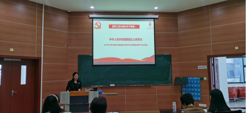 在学习《中华人民共和国爱国主义教育法》专题中,侯艳茹重点分享第一章第六条的内容,引导全体教职工将爱国主义教育的主要内容融入日常教学和工作中,深挖专业课程的思政元素,让爱国主义教育与专业课程相融通,努力在教学内容设计、教学主体互动等方面进行创新,引导学生厚植爱国主义情怀。