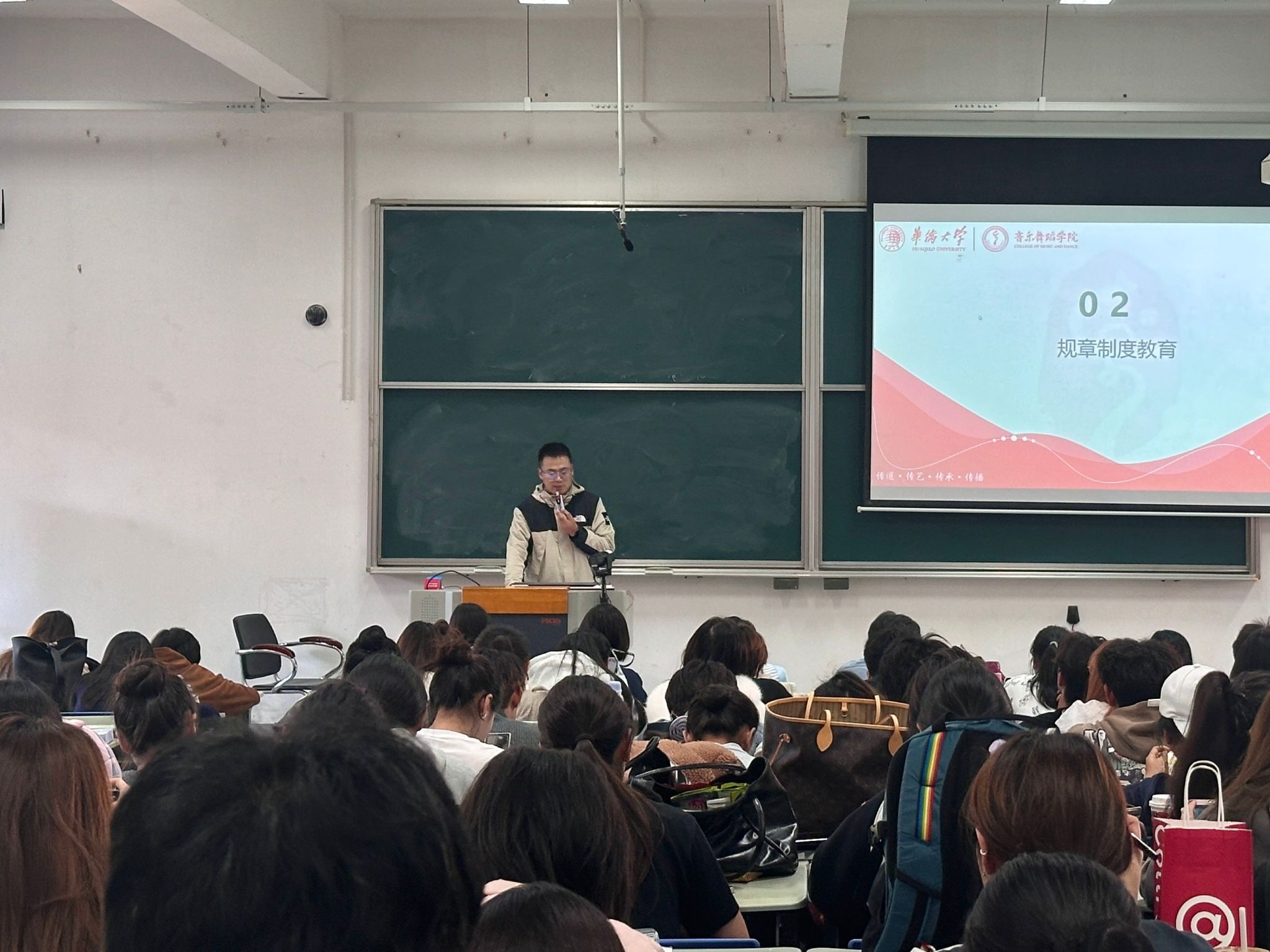 葛卫遥重申了系列管理规定,含《学生手册》及学籍、社区管理、违纪处分、考试工作等条例,提醒同学们要明晰行为准则与学业规范,了解学校管理导向,规范自身言行与学业进展。
