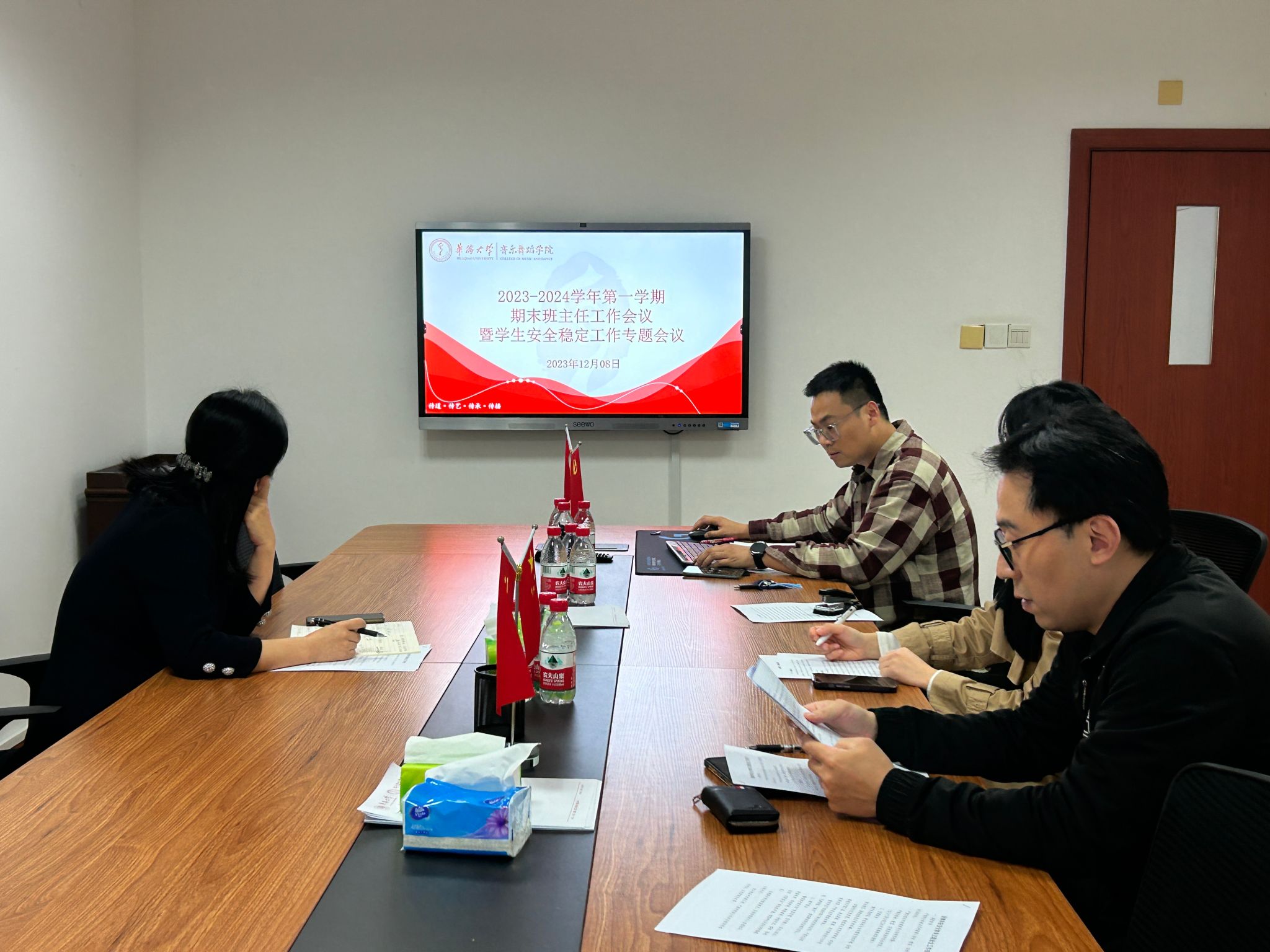 12月8日,我院在音舞楼203会议室和线上腾讯会议同步召开2023-2024学年秋季学期期末班主任工作会议暨学生安全稳定工作专题会,全体班主任、辅导员参会,会议由党委书记侯艳茹主持。