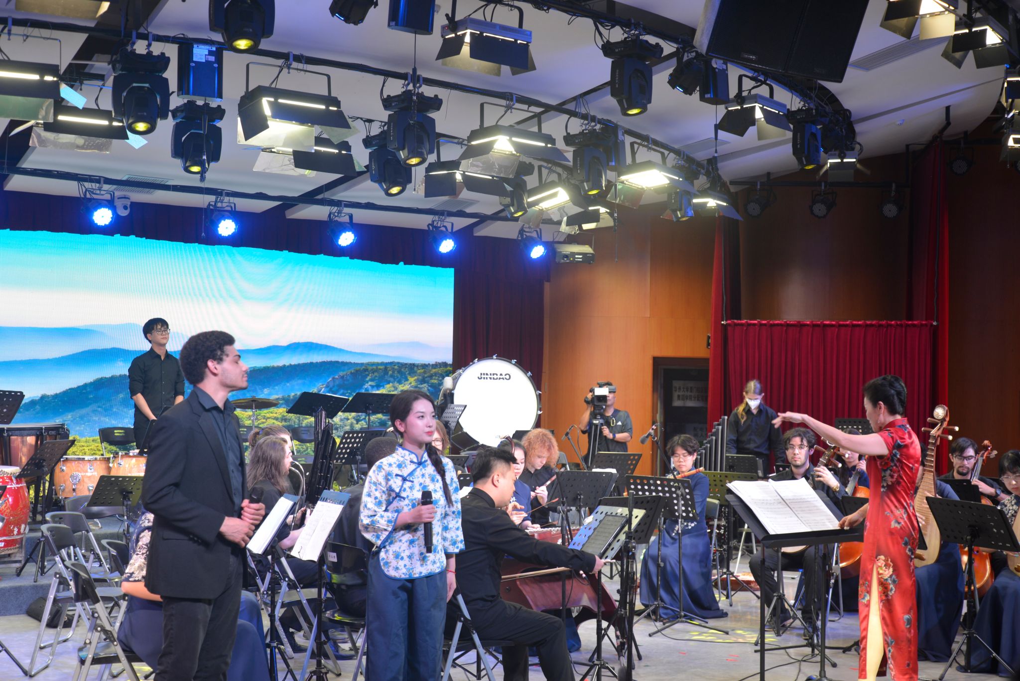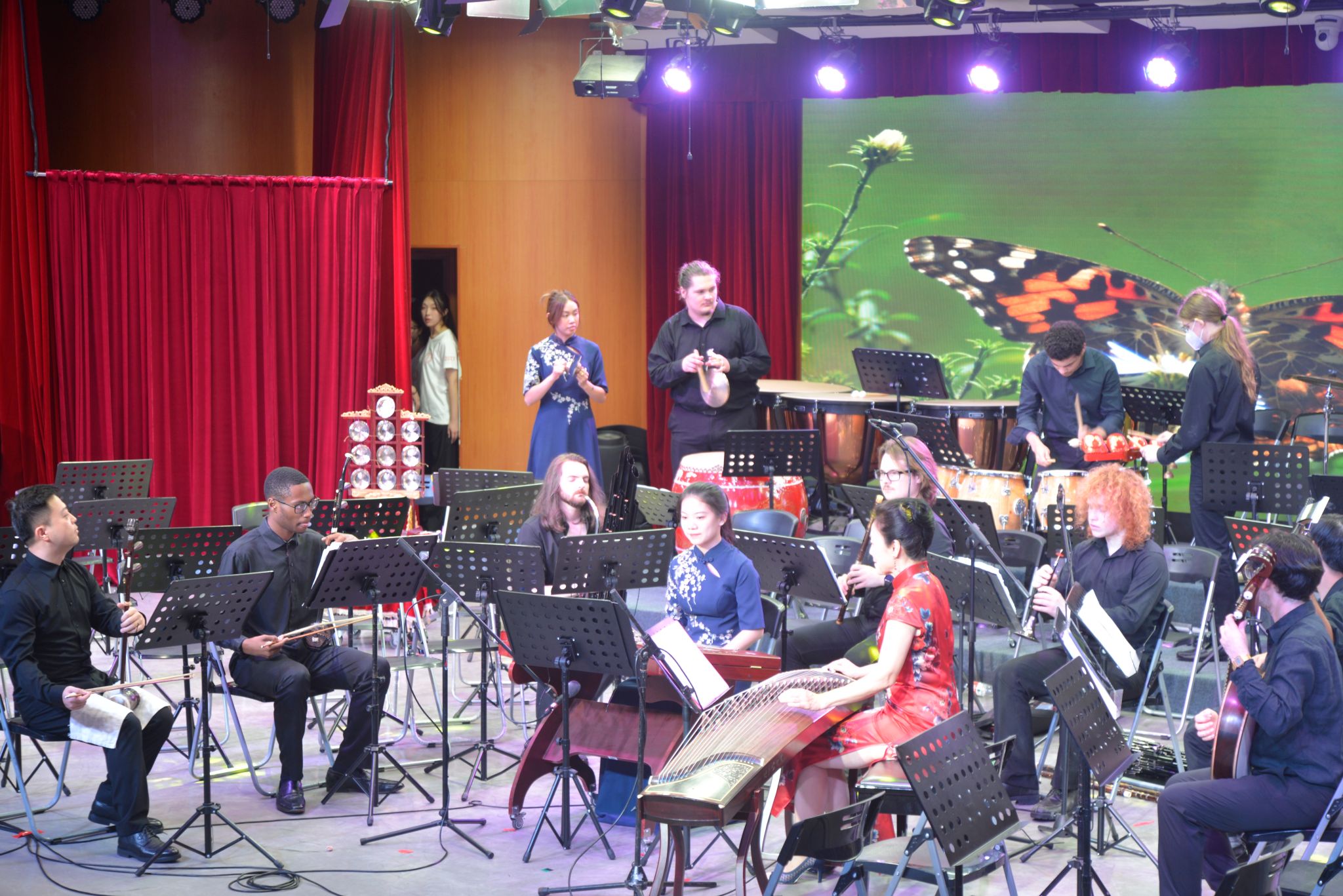 当晚演出中,来自美国中田纳西州立大学、卡尔顿学院学生用所学的笛子、唢呐、笙、箫、二胡、古筝等中国传统乐器与我院学子共同演绎了中国北方民歌小合奏《打枣》、美国蓝草音乐代表《亲爱的老迪克西》与民乐合奏曲《喜洋洋》等11首乐曲。表演者以精湛的技艺、饱满的热情,赢得了现场观众的阵阵掌声与喝彩声。