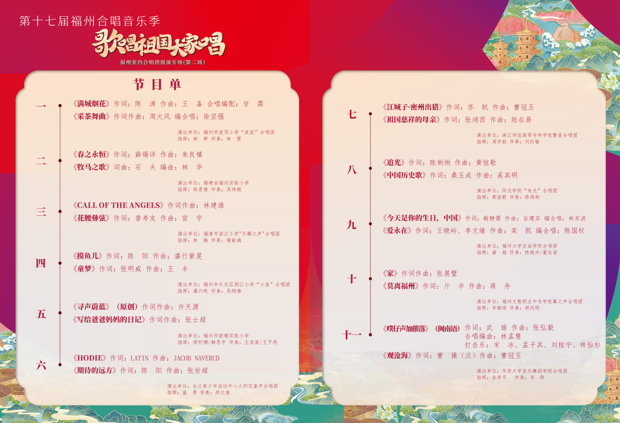 据悉,“歌唱祖国”大家唱全省群众歌咏系列活动是由福建省文化和旅游厅主办,福建省艺术馆、福州市文化和旅游局承办,福州市文化馆和福建省合唱协会执行。本系列活动是福建省文化和旅游厅为庆祝中华人民共和国成立75周年而特别策划的一场文化盛事,展示了新时代福建人民的精神风貌,旨在打响“海丝起点 清新福建”品牌,做好文化保护、传承、传播和发展“四篇文章”,引导全省群众以歌声唱响福建故事、唱响新时代。该活动的成功举办,不仅是对福建文化的传承和弘扬,更是对全省群众文化生活的丰富和提升。