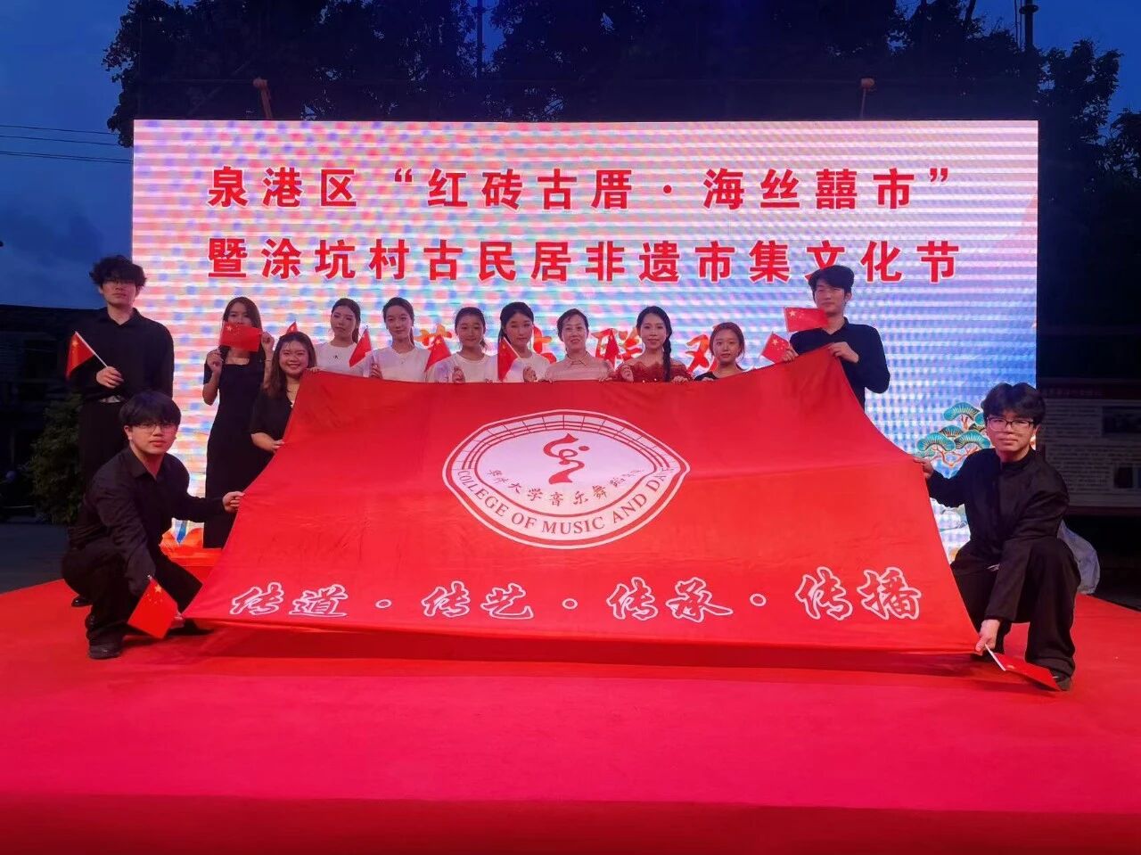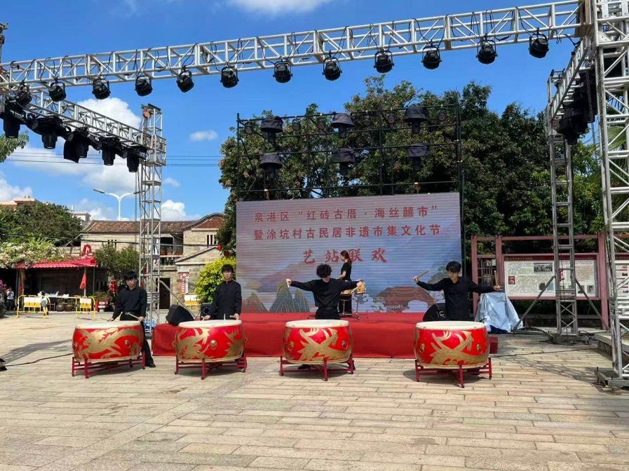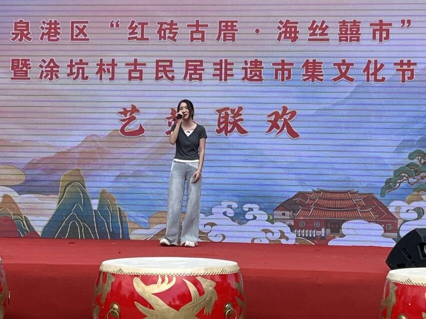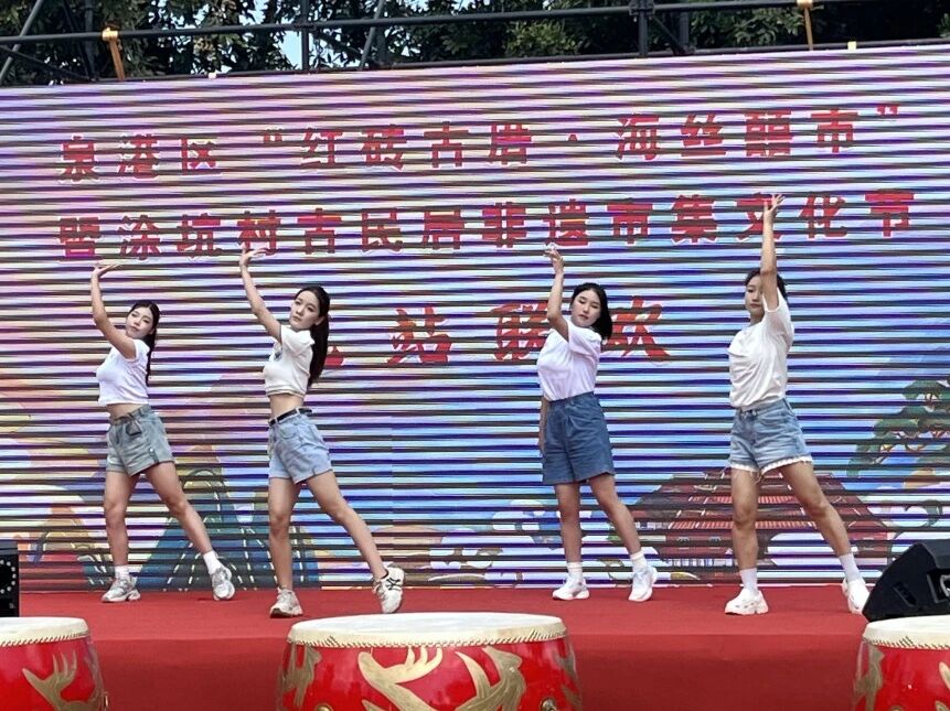 在庆祝中华人民共和国成立76周年之际,10月1日,我院师生受邀参加泉港区"涂坑村古民居非遗市集文化节",通过文艺演出等形式参与"艺术乡建"实践,为当地乡村振兴注入青春艺术力量。
