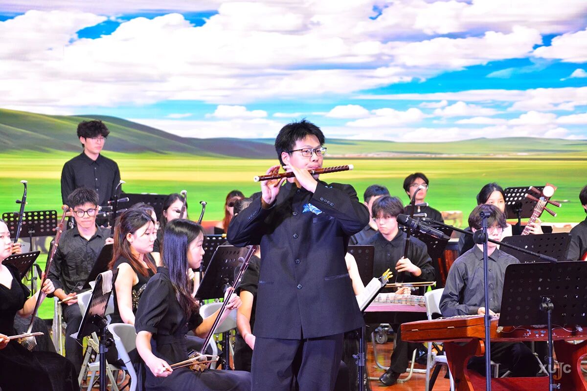 演出以热情奔放的民族管弦乐《金蛇狂舞》拉开序幕,灵动的节奏瞬间点燃现场氛围;随后,笛子独奏《牧民新歌》以悠扬旋律勾勒出草原牧歌的辽阔意境,女声独唱《绣荷包》则用婉转唱腔传递出传统民歌的细腻情感。