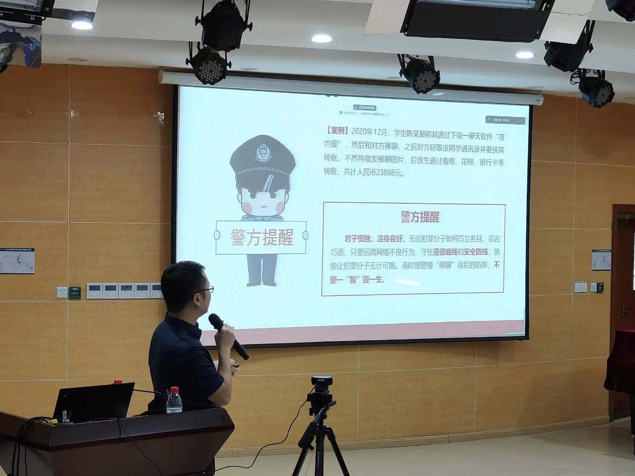 政治保卫部、保卫处王清清老师以现实案例,着重从防盗防骗、交通安全、国家安全、交通安全、防火防溺水、防毒拒毒、网络安全、自然灾害等八个方面引导新生捂紧自己的“钱袋子”、保护好“脑瓜子”。