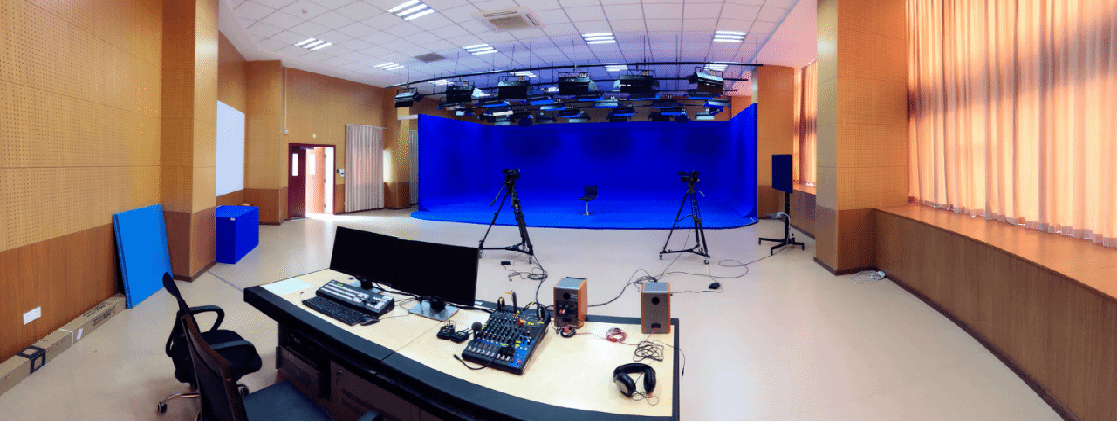 虚拟演播实验室位于李碧葱音乐舞蹈大楼的四层406室,采用四面蓝箱设计,可以进行虚拟场景下音乐节目、舞蹈节目的录播、制作活动。