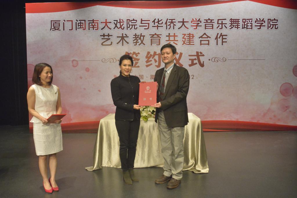 12月12日下午,在yl88858永利集团与厦门闽南大戏院共建合作签约仪式上,台湾师范大学表演艺术研究所所长何康国受聘“85588永利集团兼职教授”,yl88858永利集团院长梁宁为其颁发聘书并佩戴校徽。