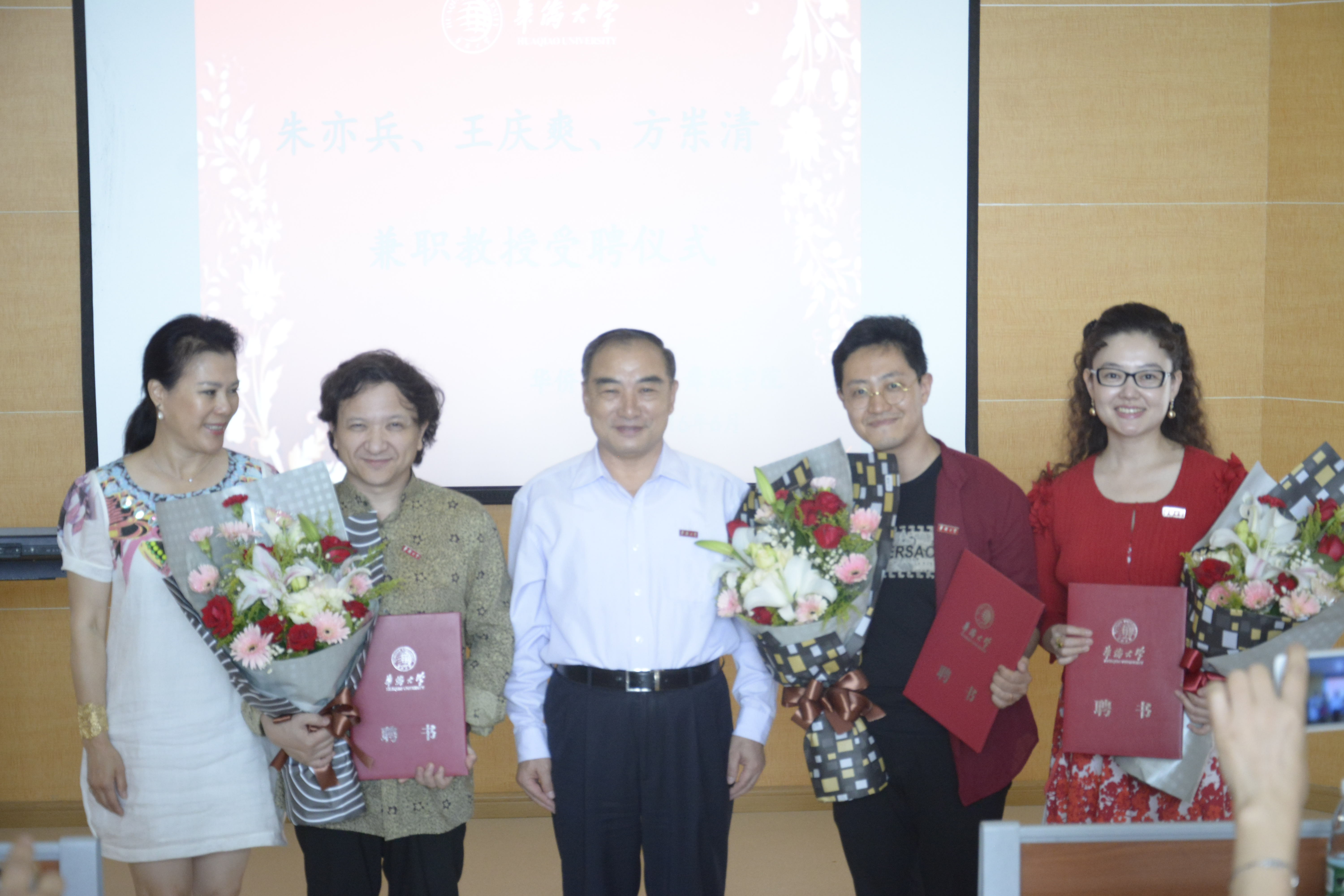 6月27日下午,在李碧葱音乐舞蹈大楼306室,中央音乐学院教授朱亦兵、中央歌剧院青年女高音歌唱家王庆爽、亚洲国际爱乐乐团驻团作曲家方岽清受聘为我校兼职教授。校长贾益民为其颁发聘书并佩戴校徽。yl88858永利集团院长梁宁主持了聘任仪式。