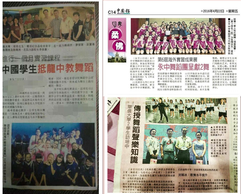 yl88858永利集团于今年三月份派出了2016届10名学生赴马来西亚柔佛州的华仁中学、新文龙独中、培群独中、永平中学、居銮中学及霹雳州的红毛丹达才小学、培元独中共计7所华校,进行了为期一个月的毕业实习,在海外实习的10名同学以扎实的专业功底,高超的教学技能、热情耐心的执教态度,赢得了实习学校师生及当地华人媒体的充分认可和高度赞誉,被马来西亚《星洲日报》、《光明日报》、《中国报》等多家报刊媒体大篇幅报道。同学们在海外以高度的责任感和使命感孜孜不倦地为华校学生传授中国传统音乐与中国传统舞蹈,圆满地完成了毕业实习任务,为学校争得了荣誉,为中华文化传播做出了自己的贡献。