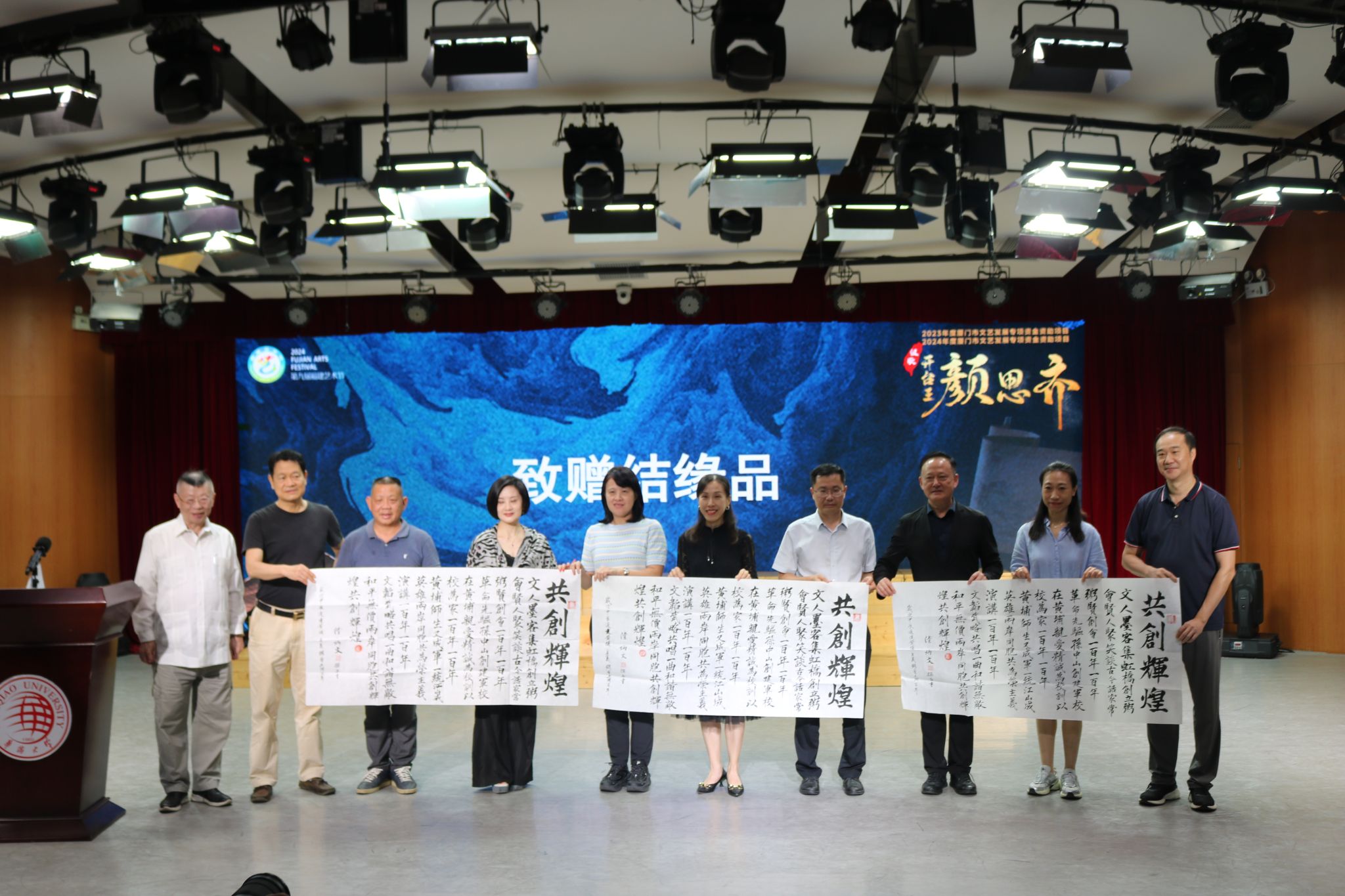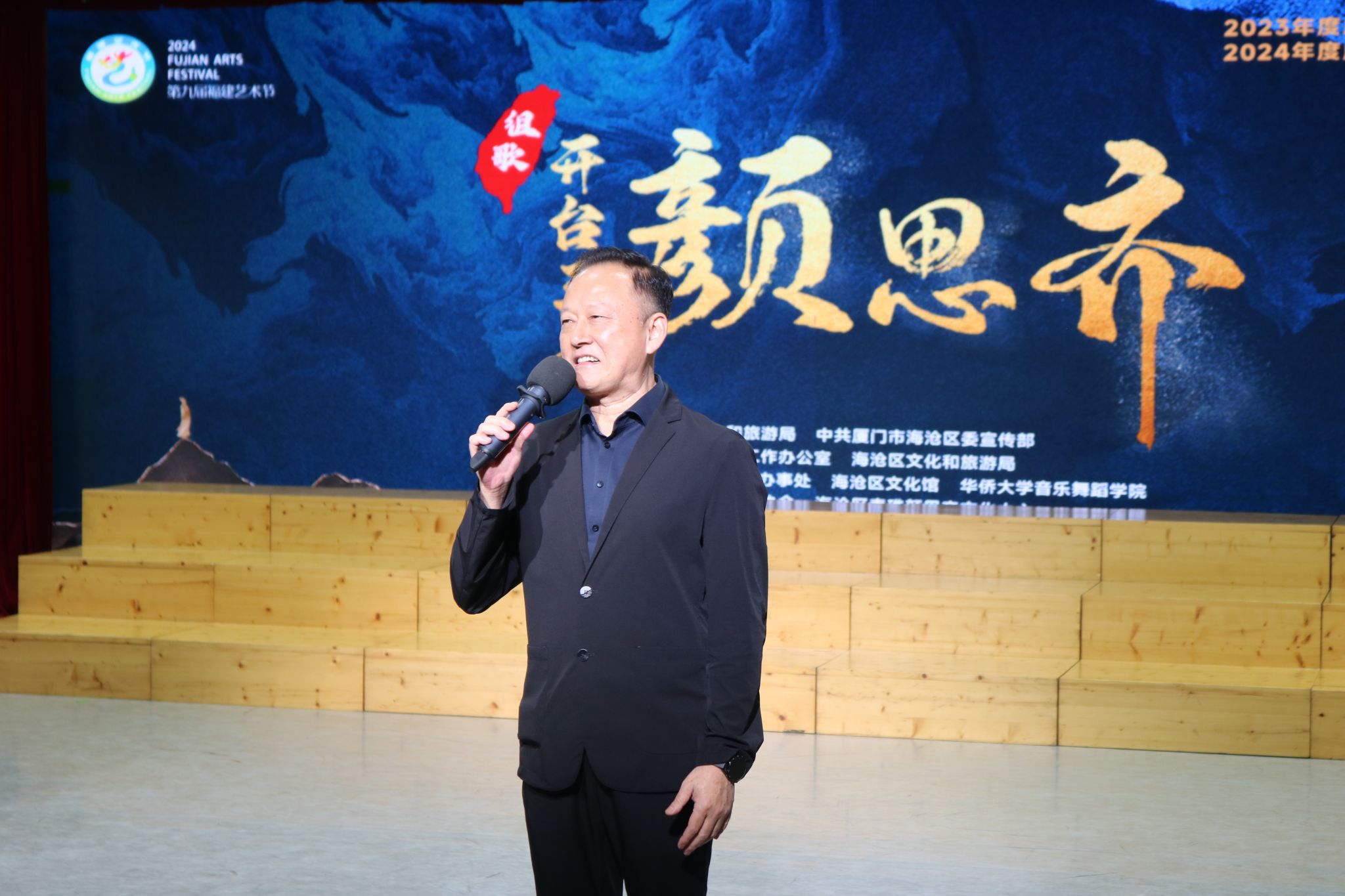 首先,导演崔勇对莅临现场的各位嘉宾及主创人员进行了介绍并表达了感谢之情。随后,台北艺术大学戏剧研究所兼任助理教授、组歌《远方》的主唱朱明月老师表达了对这部情景组歌的赞叹,并表示希望与大家一同完美演绎颜思齐的故事。台湾文化艺术界联合会理事主席、主创人员之一陆炳文教授通过“九定”讲述了开台王颜思齐的由来,并表达了对即将到来的福建艺术节展演的美好祝愿。他表示:“这次活动必将有助于闽台的融合发展,有利于两岸关系的和平发展,共创海峡两岸的辉煌!”由陆炳文教授作为代表,赠送了由台北市长蒋万安先生题词的“圆满成功”字样作为结缘品。之后,海沧区委常委、宣传部长林丽征感谢全体主创人员与演职人员能够拧成一股绳,希望能够通过这部组歌更好的传播颜思齐文化,预祝展演成功。