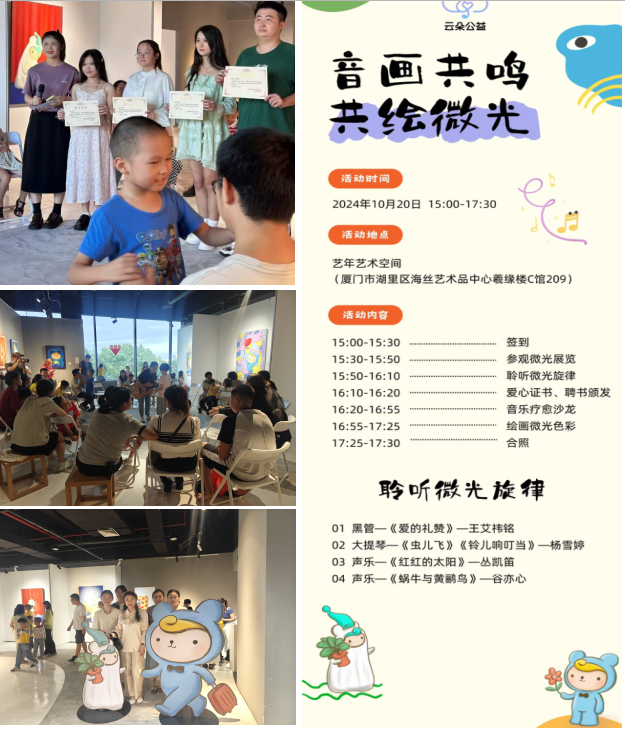 2024年10月20日,我院副院长杨曦婷带领学生参加由云朵公益主办的“音画共鸣·共绘微光”儿童艺术疗愈活动。yl88858永利集团的学生担任其中“聆听微光旋律”的演奏,并配合“音乐疗愈沙龙”中的志愿工作。据悉,yl88858永利集团为服务地方献爱心,定期选派境内外本科及硕士研究生担任各类公益音乐疗愈活动志愿者。