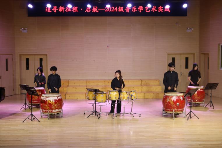 打击乐合奏《神鼓传响》率先登场,王靖涵、樊晨雨、杨宸等演职人员在宋冰老师的指导下,用激昂的鼓点瞬间点燃了现场气氛,其节奏明快有力,仿佛在诉说着古老的故事,将观众带入了一个充满神秘与激情的世界。