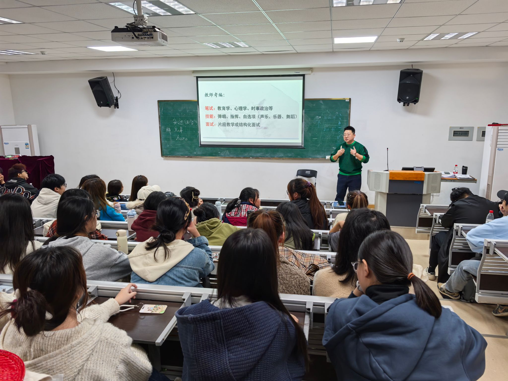 张春笋老师以自己丰富的工作经历为切入点,深入浅出地为同学们阐述了职业生涯规划的重要性。他指出,大学生正处于人生的关键转折点,做好职业生涯规划对于未来的发展至关重要。在音乐专业领域,同学们面临着诸多挑战和机遇,需要提前明确自己的职业目标,制定合理的发展路径。张春笋结合实际案例,分析了音乐专业学生可能的职业方向,包括音乐表演、音乐教育、音乐创作等,并针对不同的职业方向提出了具体的建议。对于有意从事音乐表演的同学,张春笋强调了专业技能的重要性。他鼓励同学们要不断磨炼自己的演奏或演唱技巧,积极参加各类比赛和演出活动,提升自己的舞台表现力和知名度。同时,张春笋也提醒同学们要注重团队合作,与其他音乐人建立良好的合作关系,共同创造出更优秀的音乐作品。在音乐教育方面,他认为,作为一名音乐教师,不仅要有扎实的专业知识和教学技能,还要有爱心、耐心和责任心,关心学生的成长和发展。张春笋还分享了自己在教学过程中的一些经验和方法,如如何激发学生的学习兴趣、如何提高教学质量等,让同学们受益匪浅。此外,张春笋还鼓励同学们要敢于创新,勇于尝试新的音乐风格和表现形式。在当今多元化的音乐市场中,只有不断创新才能脱颖而出。