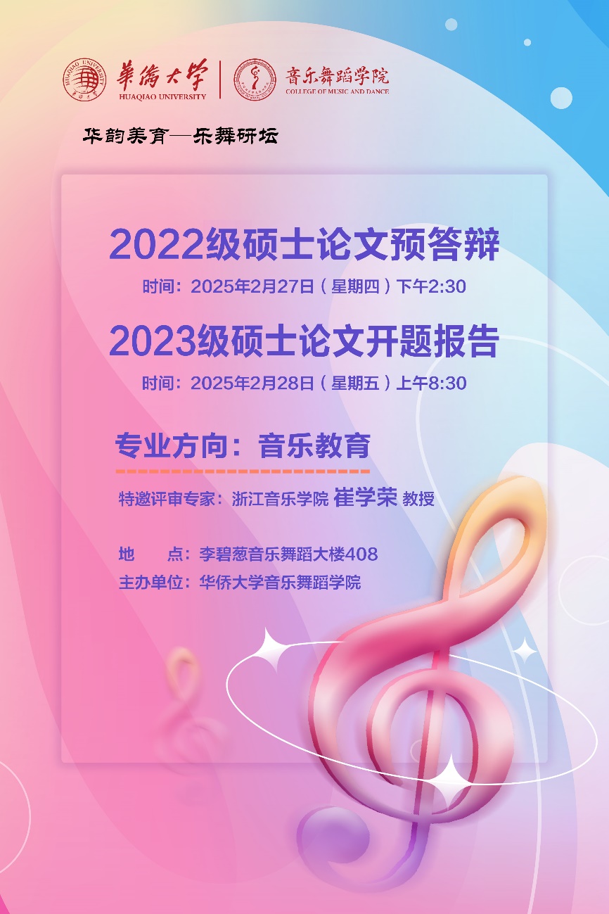 2月27日至2月28日,学院2022级研究生预答辩、2023级研究生开题报告在李碧葱音乐舞蹈大楼408教室顺利举行。本次答辩特邀浙江音乐学院崔学荣教授担任答辩委员会组长,学院何丽丽教授、檀革胜教授、余幸平副教授、张媛副教授、杨曦婷副教授担任答辩委员,全体硕士生导师列席旁听。学校督导胡日东教授参与答辩会,并给出指导意见,各级研究生踊跃参与,学术氛围浓厚,反响热烈。