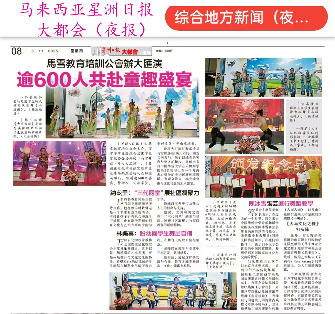 实习期间,两位同学结合幼儿特点设计趣味课程,通过维吾尔族、汉族、蒙古族、汉唐舞、苗族等经典民族舞和古典舞的动作教学,以童谣、道具辅助课堂互动,激发孩子们对中国舞蹈的兴趣。11月1日,六所幼儿园联合举办汇演,陈冰雪指导的幼儿表演蒙古族元素集体舞《草原小骏马》、汉族元素舞蹈《小看戏》、汉唐元素舞蹈《小唐俑》;张芸指导的幼儿表演《苗家娃娃》、维吾尔族舞蹈《古丽古丽》、蒙古族律动舞蹈《马蹄哒哒哒》。孩子们以自信的舞姿展现学习成果,获园方、家长及当地教育局好评,并受马来西亚星洲日报、大都会(夜报)、中国报、南洋商报等媒体专版报道。