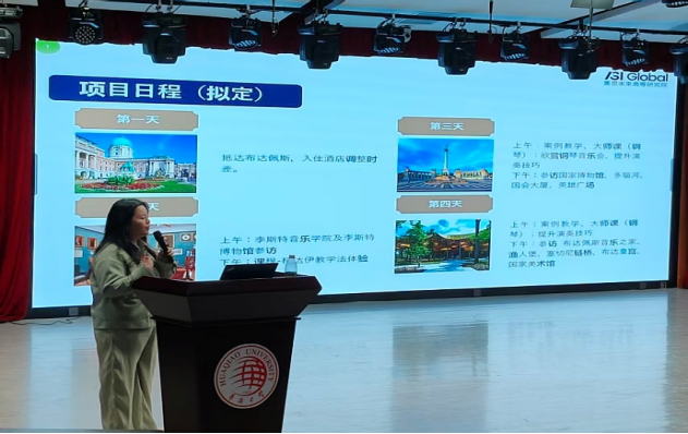 在项目推介环节,匈牙利李斯特音乐学院艺术研修项目负责人介绍匈牙利的文化特色、李斯特音乐学院的教学优势以及研修项目的具体行程安排。英国曼彻斯特大学语言文化冬令营项目负责人就该项目的办学历史、课程特色、教学安排及往期成果进行了全面说明。两位负责人就同学们关心的相关问题进行现场解答,现场互动气氛热烈。