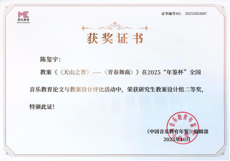 研究生陈玺宇(导师:檀革胜)的《〈天山之普〉—〈青春舞曲〉》荣获“研究生教案设计组”二等奖。