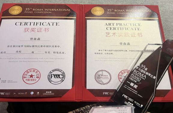 近日,备受瞩目的第35届罗马国际钢琴比赛中国区决赛圆满落幕。我院副院长杨曦婷副教授受邀担任本次赛事艺术总监,在其专业指导与引领下,2024级音乐(专硕)曾森淼同学凭借卓越的演奏技艺和稳定的发挥,斩获高校组一等奖;2024级音乐(专硕)郭子怡同学积极参与赛事组织工作,从实习实践层面加深了对艺术活动整体运作的理解,展现了音舞学子的专业素养与综合能力。