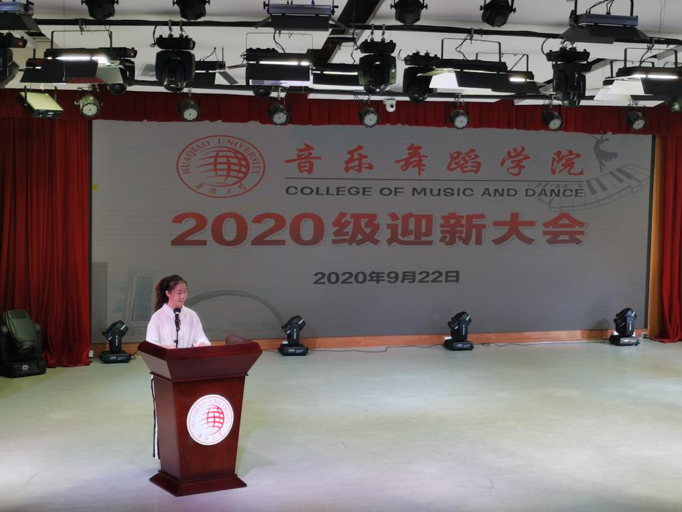 老生代表2018级舞蹈表演班牛雅甜与新生分享了“一个目标,两种热情,三种能力”。并且希望同学们在学习、工作、生活中找到一个正确的支点并为之努力,锲而不舍,一定要珍惜时间,踩出 属于自己的 坚实的脚印。之后便是新生代表2020级舞蹈学班廖婧蕊发言,号召在接下来的大学生活中我们要努力做到树立高远目标,培养团结情谊,增强坚韧毅力,提高专业素养,培养自律习惯。