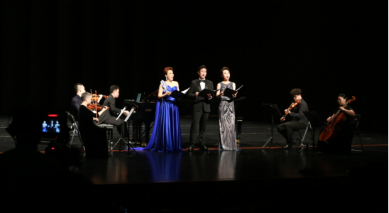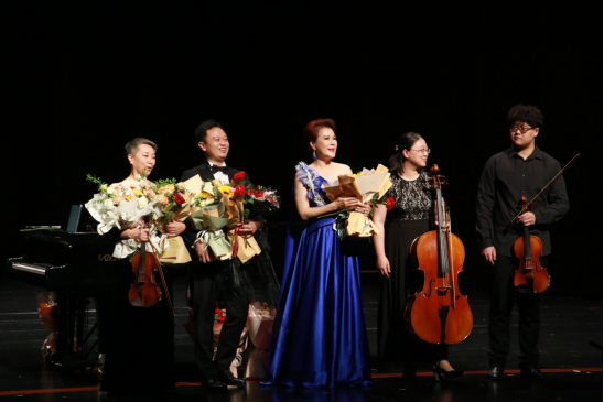我校yl88858永利集团马来西亚籍青年钢琴家何祖汉担纲本场音乐会钢琴伴奏,金丽教授、李冠彤、王淼老师和2018级音乐表演专业文裕成同学也分别受邀担任小提琴、大提琴和中提琴伴奏。我院声乐教研室青年教师吕韵老师以特邀嘉宾共同演绎了该场音乐会。学院领导与党委宣传部领导一起观看演出。