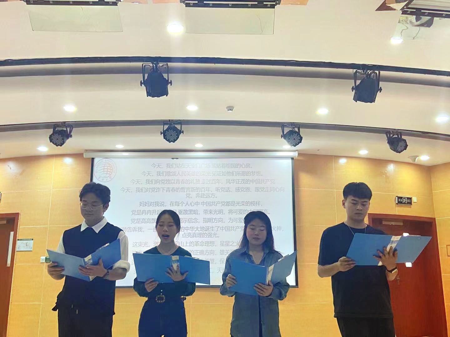 动员会现场,姚文帅、汲渝焜、刘妍、黄聘然等四位同学作为积极分子代表重温并朗诵了在庆祝中国共产党成立100周年大会上共青团员和少先队员的集体献词,发出了“请党放心,强国有我”的青年号召!