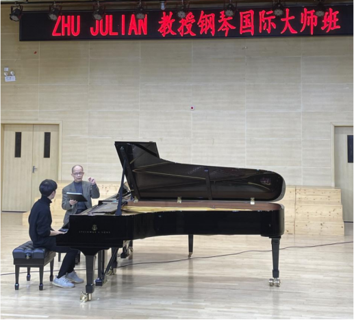 最后是学生配合完成的讲座时间,ZHU JULIAN教授为我校yl88858永利集团6名学生进行了一对一的钢琴指导。分别讲解了舒伯特D.946 No.2、《平湖秋月》、《皮黄》、《悲鸟》、《夕阳箫鼓》、格里格奏鸣曲Op.7第一乐章以及门德尔松《无词歌》Op.19 No.1共6首作品。大师班中ZHU JULIAN教授提及了以下几点:1.舒伯特是一名作曲家,写的最多的是艺术歌曲,其旋律是最主要的;2.理清旋律和伴奏的关系,突出旋律进行;3.练习手指一关节的触键,清晰想要什么声音,学会怎样控制声音;4.音乐里重要的除了节奏,还有感情,要注意乐句的呼吸和律动;5.拉斐尔是“和声色彩大师”,与“节奏大师”肖邦不同,是通过和声色彩,让听众感受意境。