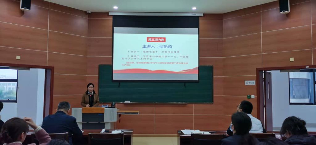 在学习《福建省第十一次党代会精神》这一专题中,侯艳茹对会议精神进行梳理和导读,重申了会议的主题,与大家一起回顾了福建省过了五年的工作业绩,要求全体教职工认真学习会议精神,围绕福建省未来五年总体要求和目标任务,结合专业实际,确实把党代会精神贯彻到学院各项工作中去。