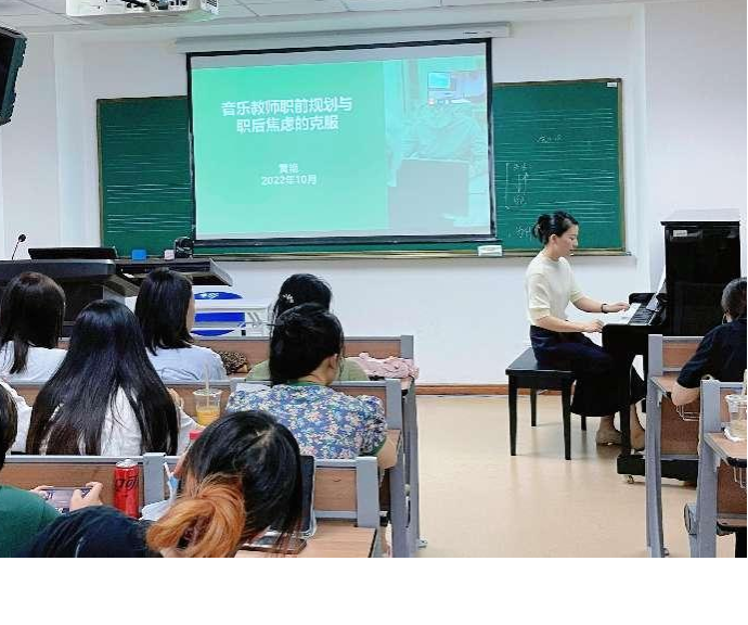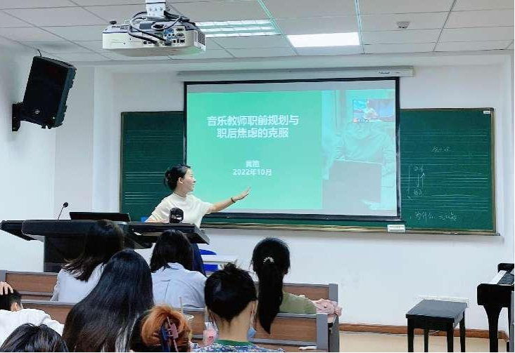 黄艳老师从“音乐教师入职前职业规划和入职后如何克服”两大方面做了详细的交流。“如何成为一名编内的音乐教师?入职前我们应该做哪些准备?成为音乐教师后如何尽快适应工作环境?”等一系列问题黄艳老师都做了细致的讲解,让同学们直观的了解到音乐教师这个职业,同时也对招聘过程中的侧重点和细节有了更进一步的把握。