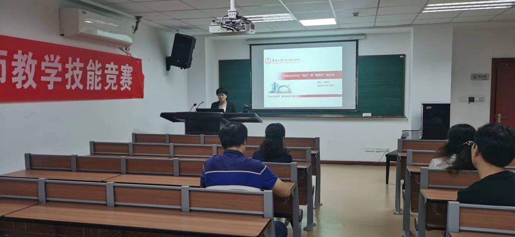 青年教师教学技能比赛采用现场教学形式,每位参赛教师自选授课章节,现场授课15分钟。学院教学工作委员会成立了评审组现场听课。评审组主要从教学设计、教学内容、教学组织实施、教师基本素养四个方面对参赛老师的课堂进行综合考核。