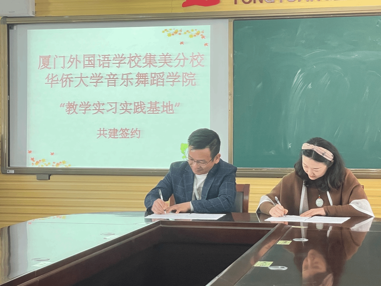 签约仪式开始前,杨曦婷副院长首先介绍了学院的音乐学、音乐表演、舞蹈学三个专业的学科建设和人才培养情况。黄宁艺校长随后详细介绍厦门外国语学校集美分校的办学成果与音乐社团活动的开展情况,并强调校园艺术活动的开展与举办对学生综合素养以及个人发展的重要性。双方就如何深化联合培养实习生、促进高校与中小学合作,提升中小学艺术教育水平等问题展开交流和研讨,并就具体合作方案达成了一致意见。