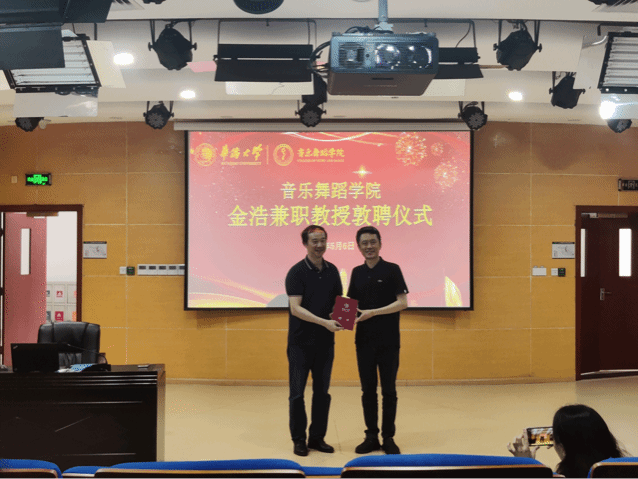 5月6日上午,在李碧葱音乐舞蹈大楼216多功能厅,学院举行了金浩研究员兼职教授敦聘仪式,余幸平副院长为金浩教授颁发聘书。