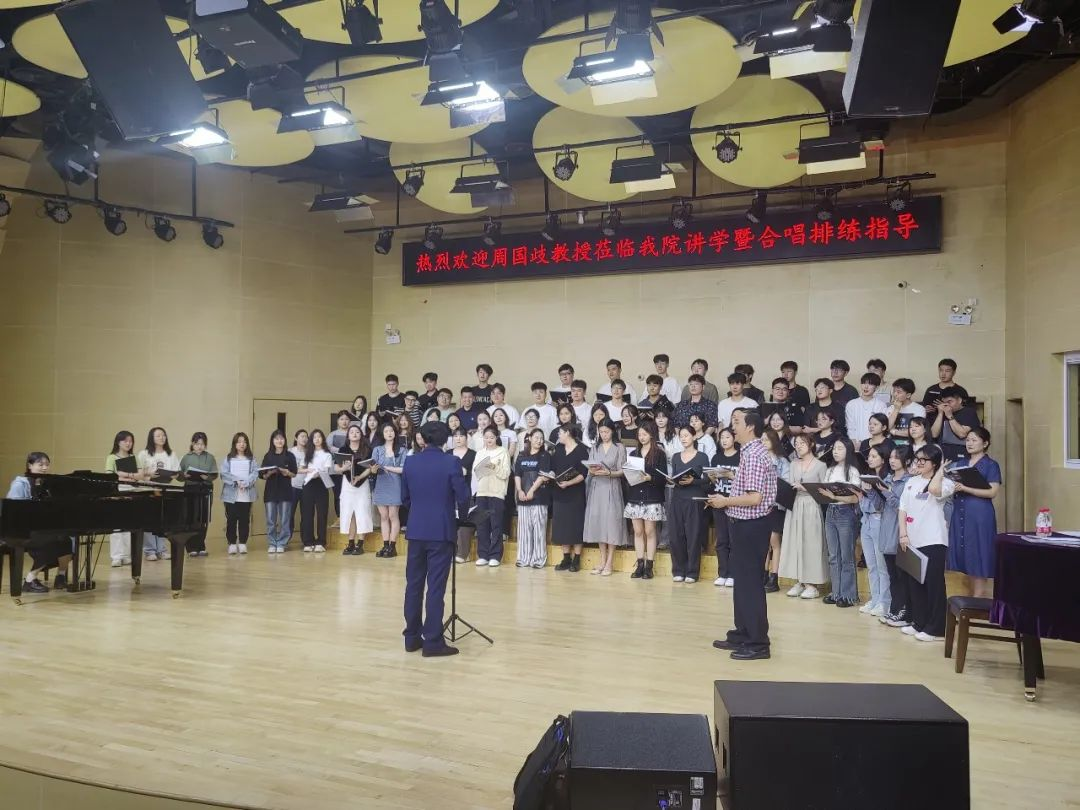 讲座结束后,在音乐厅排练现场,周国歧一方面为同学们从其作为创作者的角度上解读了《破陈子·醉里挑灯看剑》这一作品的细节,同时将讲座中的理论表达与实际演唱结合在一起,使参与排练的同学们对作品有了更深的理解,便于更完美、准确地演绎该作品,排练效果十分突出。