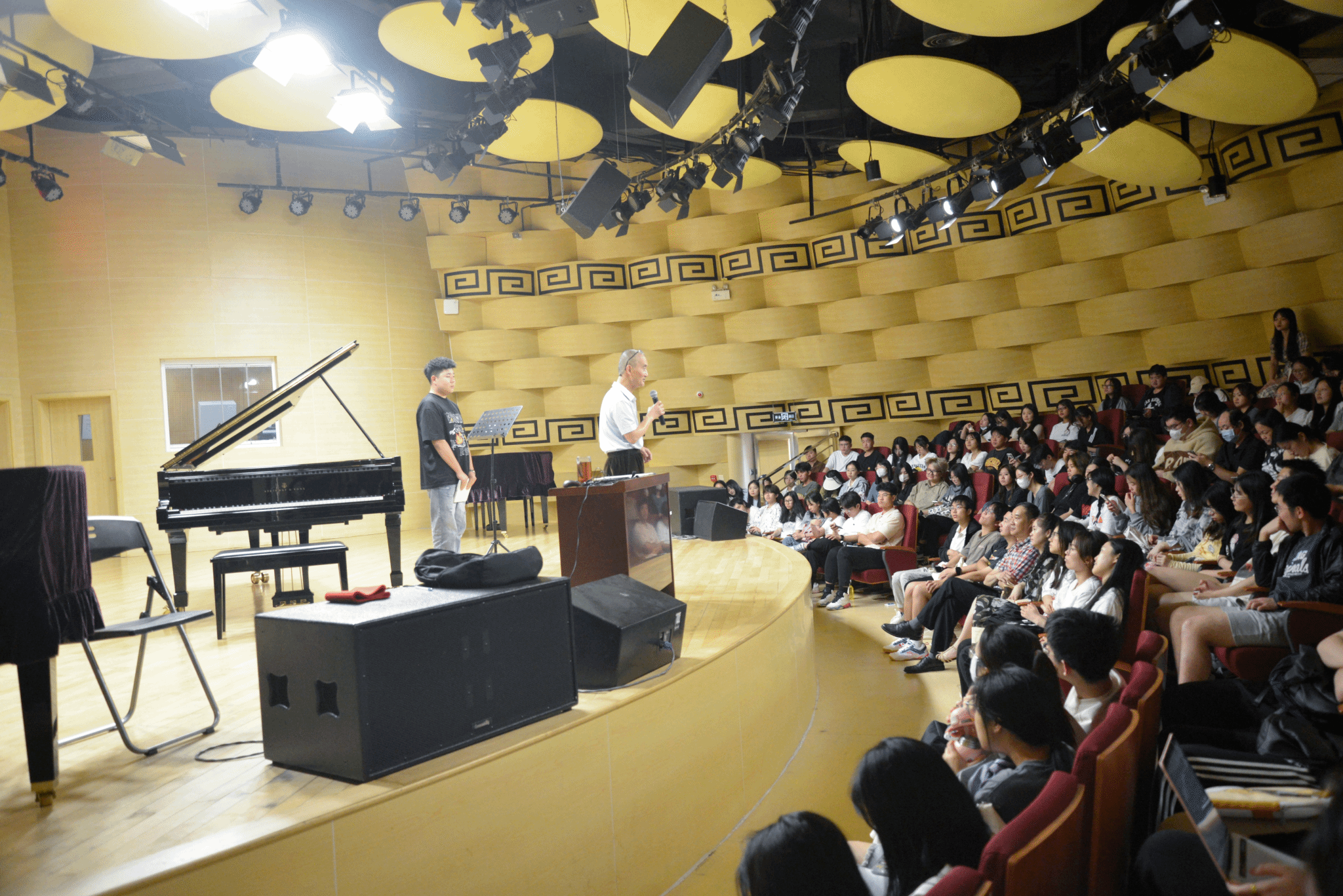 本次讲座在全体师生与倪林副教授合作的《我只在乎你》和《再回首》的歌声中结束,在钢琴伴奏下,所有人齐声歌唱,气氛热烈且动容。 最后杨曦婷副院长总结,很荣幸邀请到倪林副教授,他高要求、谦逊的精神非常值得我们学习,感谢他通过幽默风趣的语言,风格鲜明的演奏为我院师生带来一场高水平的钢琴伴奏作品的赏析讲座,为我院师生提高钢琴伴奏水平,培育良好的音乐素养提供了重要帮助和指导。