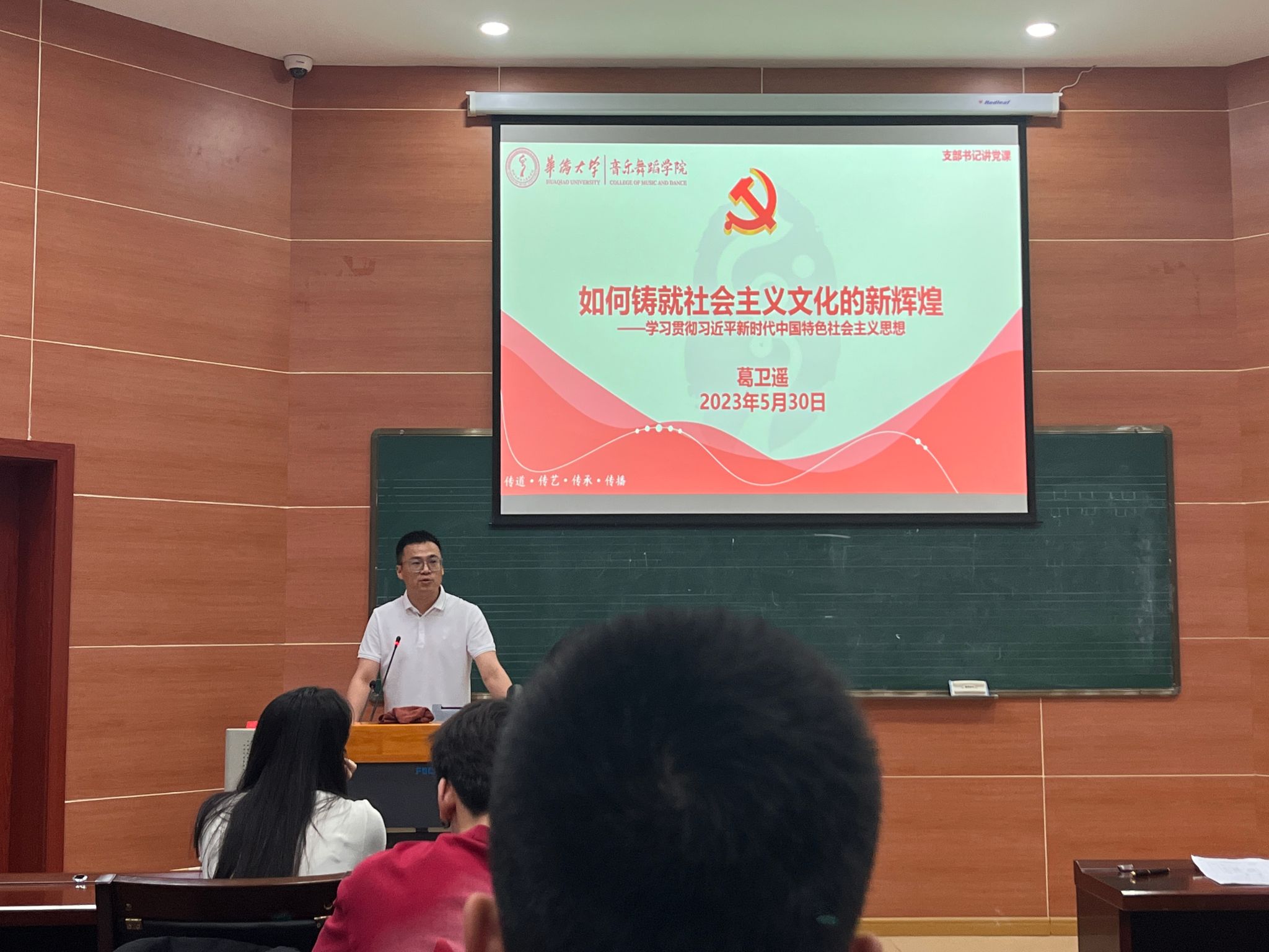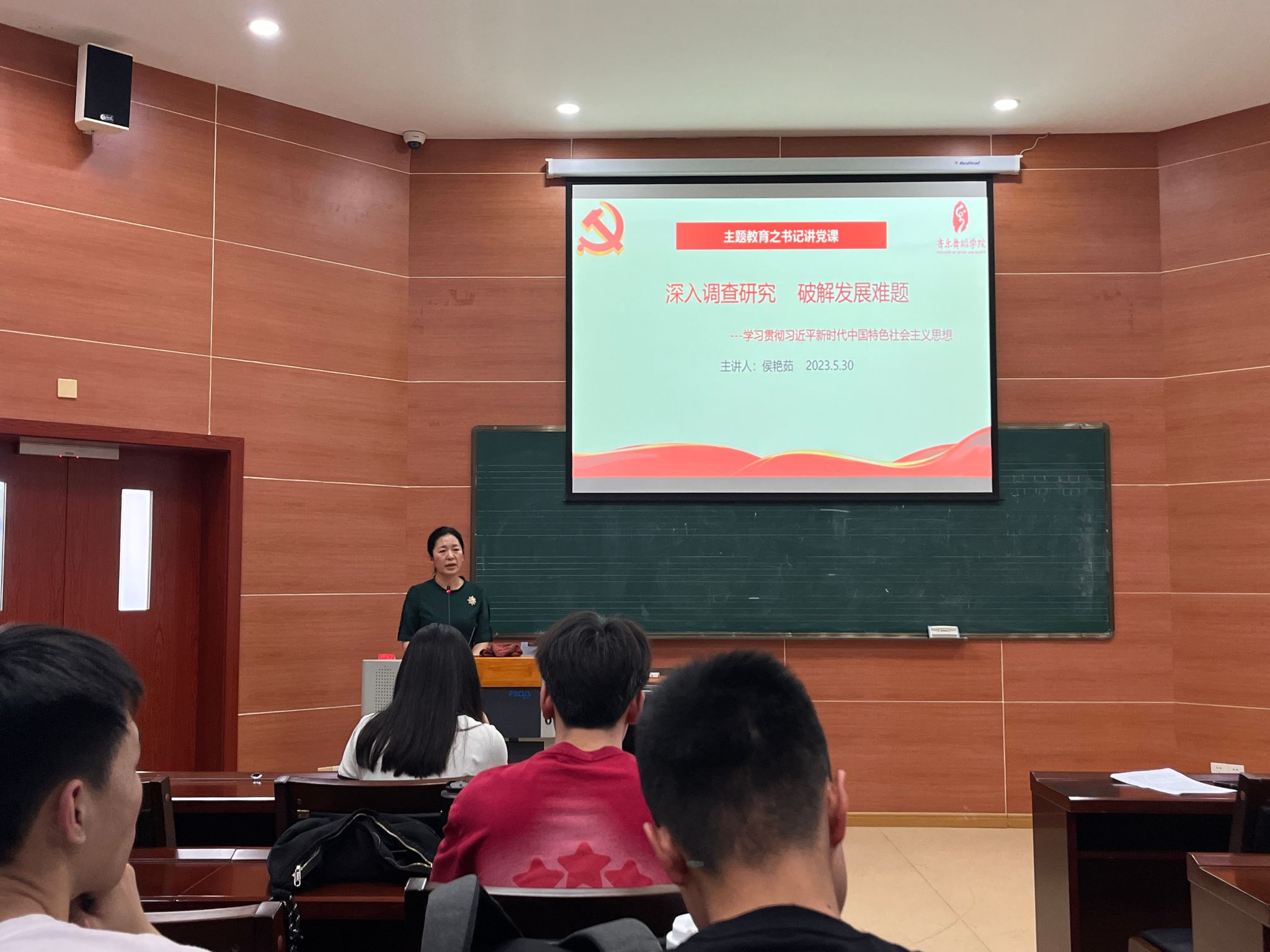 党委书记侯艳茹首先以“深入调查研究,破解发展难题”为主题,从为什么要开展主题教育、为什么要进行调查研究、怎样进行调查研究、学院从哪几个方面开展调查研究等四个方面入手,讲述了本次主题教育的重要举措以及中国共产党对调查研究工作的重视。侯艳茹书记强调:“调查研究是我们党的传家宝,是做好各项工作的基本功,是党的思想路线和群众路线的内在要求。”侯艳茹也介绍了学院在主题教育中为推动学院发展,确定了“如何提高毕业生毕业去向落实率、如何结合‘本科教育教学审核评估’启动师范认证、结合党建与思政元素,打造舞台艺术实践精品、中华传统乐舞在海内外传承传播的实践研究”等四个调研主题,希望广大学生党员能够根据自身实际情况投入到学院开展的调研中去。