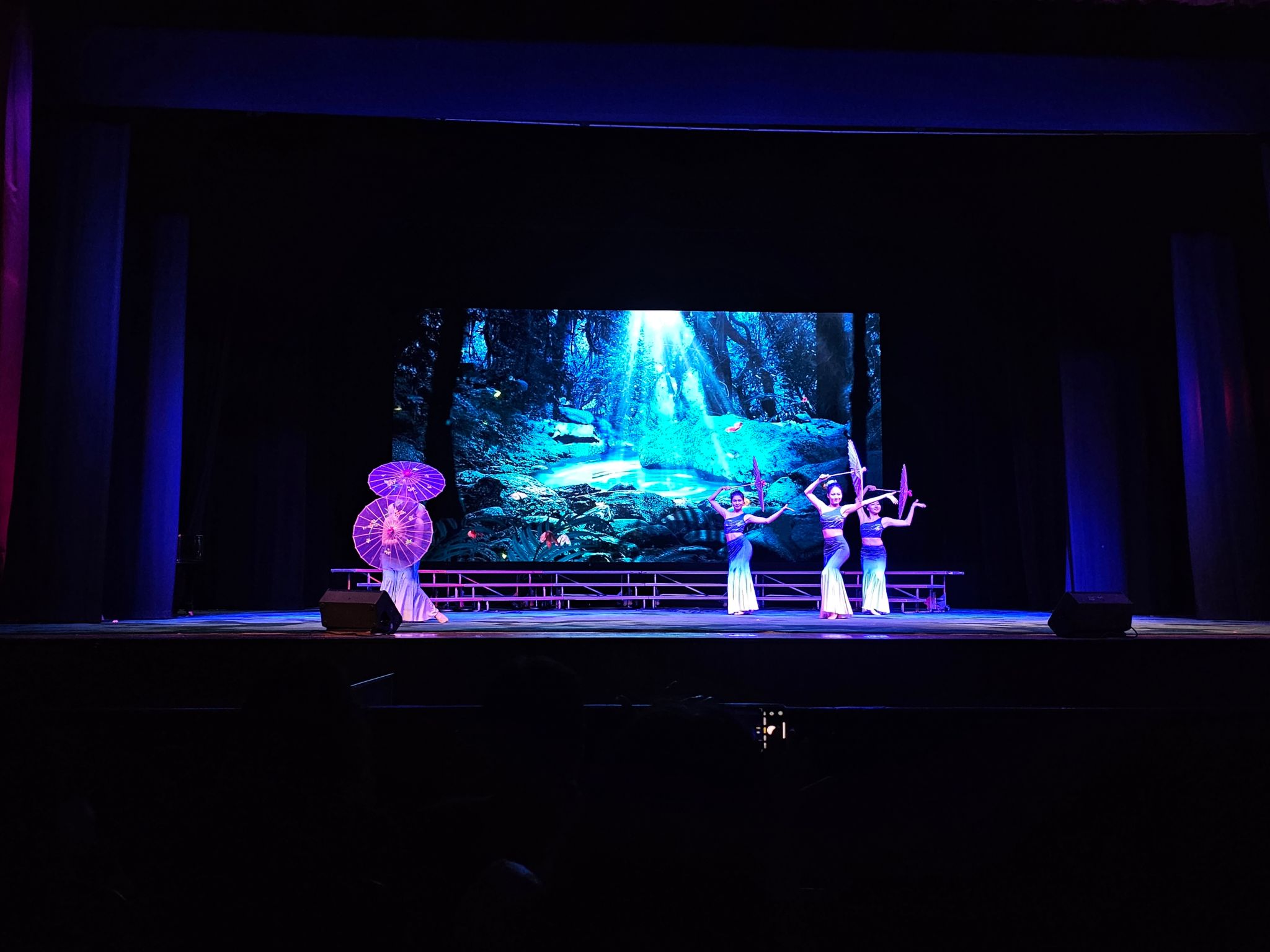 晚会现场人山人海,座无虚席。身着蓝紫色衣裙、手持粉紫色油纸伞的少女于舞台中翩然起舞,结合舞台背景墙上的潺潺流水,为观众带来了如梦似幻的视觉奇旅。晚会表演节目以歌舞、器乐合奏为主,其中更有傣族舞蹈、蒙古族舞蹈等颇具少数民族特色的演出,向观众展现出中华文化的多元魅力。