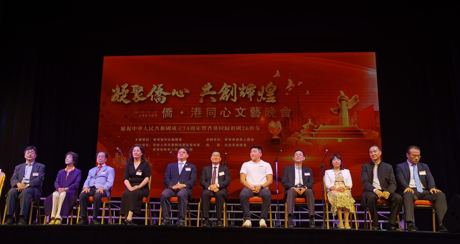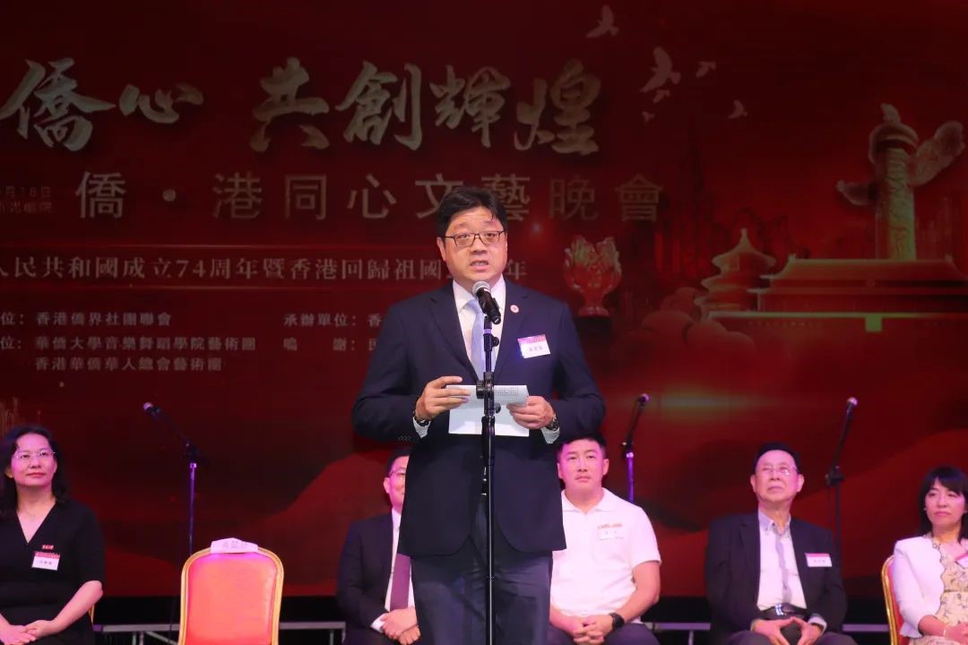黄楚基致辞时表示,晚会旨在庆祝香港回归祖国26周年和中华人民共和国成立74周年,同时也为响应香港特区政府民政事务总署推出的“祖籍联系 思祖寻源”同乡文化推广活动。他说,新中国成立74年来,国家发展成就举世瞩目,中华民族伟大复兴进入了不可逆转的历史进程。今年是全面贯彻党的二十大精神的开局之年,也是香港发展步入由治及兴新阶段关键期的起步之年。随着中国式现代化建设的不断推进,香港也正奋力迈向高质量发展,相信在“一国两制”方针坚实保障下,香港定能创造更多辉煌,“东方之珠”必将更加光亮夺目。他希望这次歌舞演出能够广泛传扬侨胞的爱国情怀,讲好中国故事,凝聚侨心,汇聚侨力,让爱国精神薪火相传。