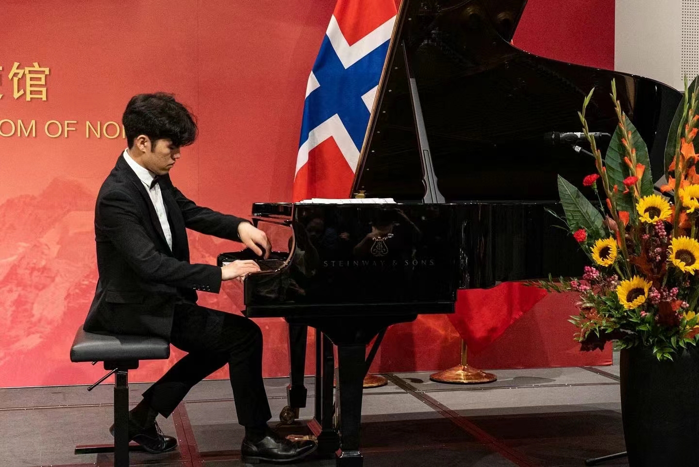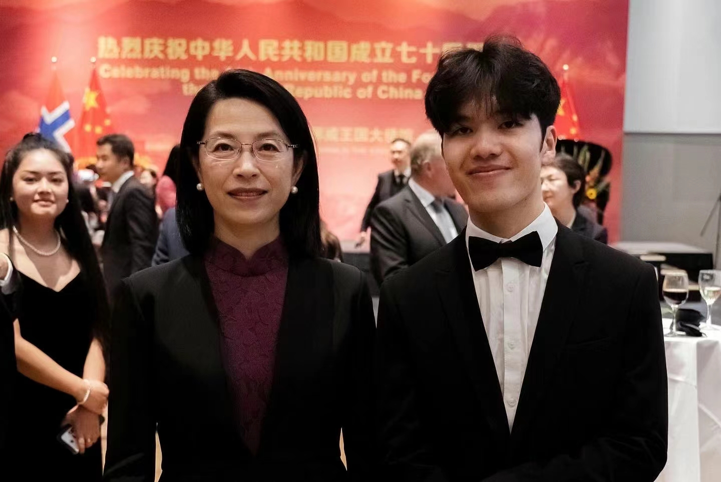 我院2022届毕业生李达成受中国驻挪威使馆邀请,在国庆招待会现场演奏《彩云追月》等中国钢琴曲,弘扬中国经典音乐,传播中华文化,并获得了中国驻挪威大使侯悦以及各国友人们的赞赏。