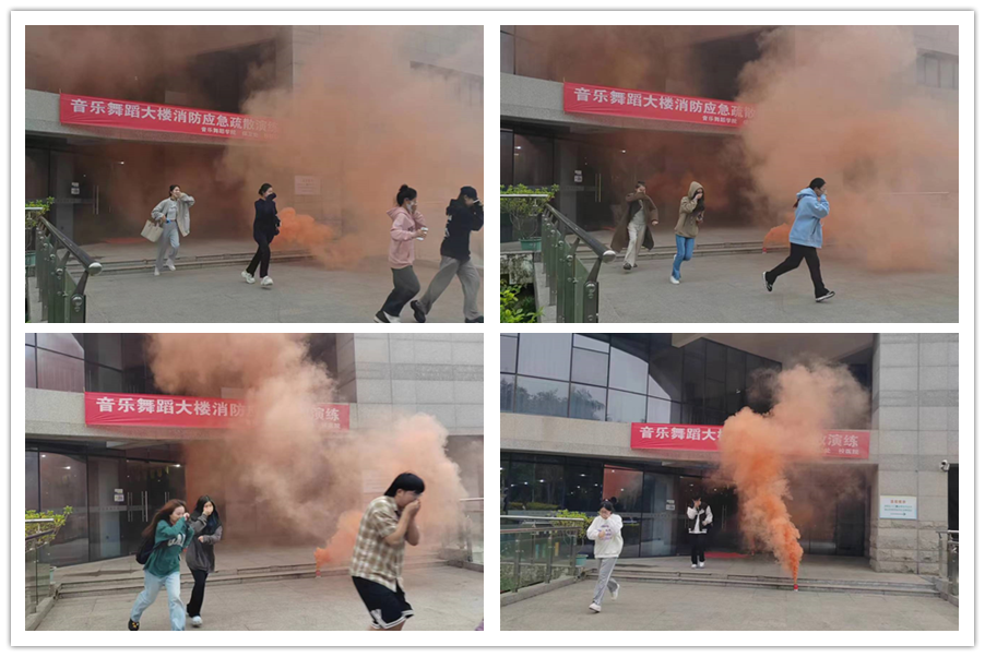 12月5日下午,学院联合保卫处、校医院在音乐舞蹈大楼开展了消防疏散演练。此次演练包括应急逃生疏散、灭火救援、紧急情况下医疗救护、消防器材装备展示和体验等环节。本次演练模拟音乐舞蹈大楼3层服装储藏室附近发生火情,消防警报响起,楼内同学听到警报后,手持湿毛巾捂住口鼻,弯腰附身迅速撤离到音舞大楼一层外围平台。保卫处黄家德老师通过现场演示、互动问答等形式,为同学们详细介绍了学校密集场所防火常识和火场逃生自救方法,展示了各类灭火器、灭火毯、消防水枪等消防器械装备的使用方法,并现场指导学生正确使用灭火器进行灭火实践。