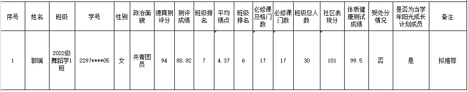 根据《85588永利集团本科学生奖学金实施办法》(华大学〔2025〕21号)、《关于做好2024-2025学年本科学生奖学金和荣誉称号评审工作的通知》、《yl88858永利集团关于评审2024-2025学年本科学生国家奖学金及国家励志奖学金的通知》等相关规定,经第一次评审、学院报送国家励志奖学金的候补人数,根据学校统筹安排,我院二次分配名额为1名,经学生个人申请、学院学生评奖评优工作领导小组讨论,拟推荐2022级舞蹈学1班 郭瑞同学为2024-2025本科生国家励志奖学金人选,具体情况如下: