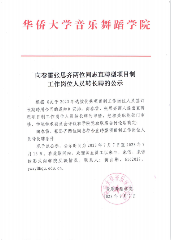 向春雷张思齐两位同志直聘型项目制工作岗位人员转长聘的公示