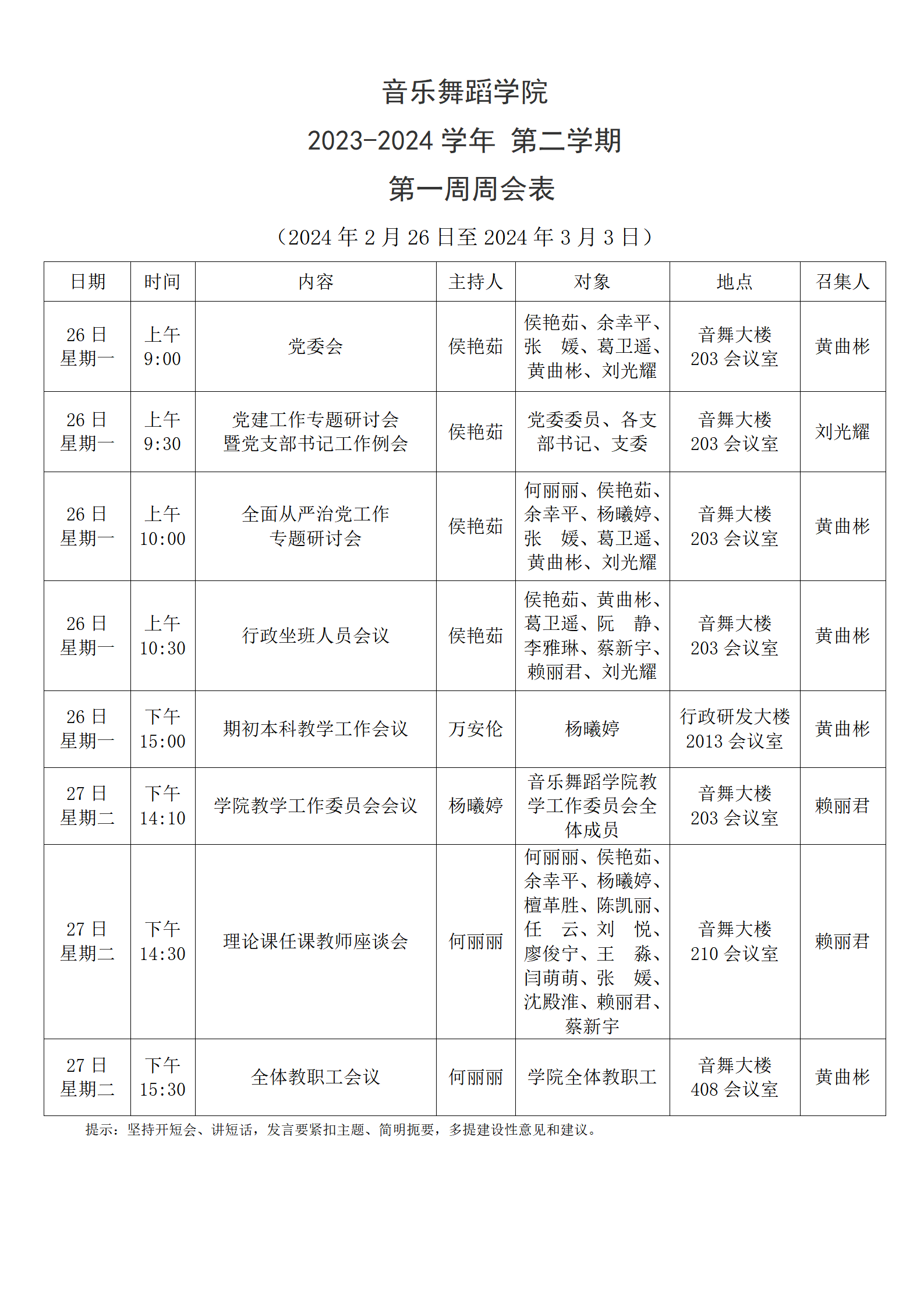 yl88858永利集团2023-2024学年第二学期第一周周会表