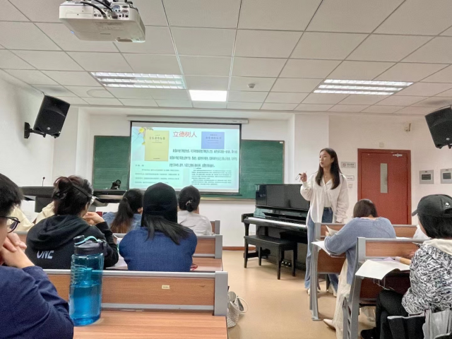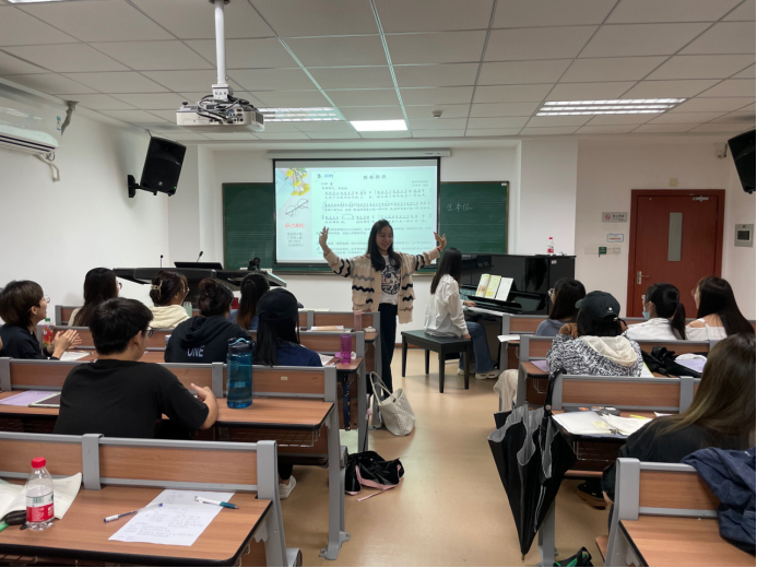 在课堂上刘怡君老师分别采用《嘎达梅林》和《牧歌》为例为同学们讲解教学设计的构思,通过示范演奏和演唱作品在节奏及语音语调上的处理差异引导同学们去思考教学目标中知识与技能方面的讲授方法。此外,也鼓励同学们以《青春舞曲》为例尝试设计教学过程,刘怡君老师边弹钢琴,同学们边唱,舞蹈方向的夏巧巧同学也在课堂上随之舞动了起来,整个课堂的氛围十分活泼与融洽。