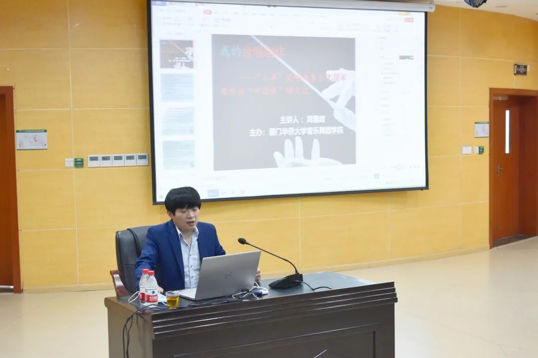 5月9日下午,我院邀请了青年作曲家、指挥家周国歧副教授在李碧葱音乐舞蹈大楼216多功能厅作题为《人声交响性器乐化与中国风诗歌文化》的学术讲座,并在讲座后于音乐厅进行了周国歧合唱作品《破陈子·醉里挑灯看剑》的实践排练。