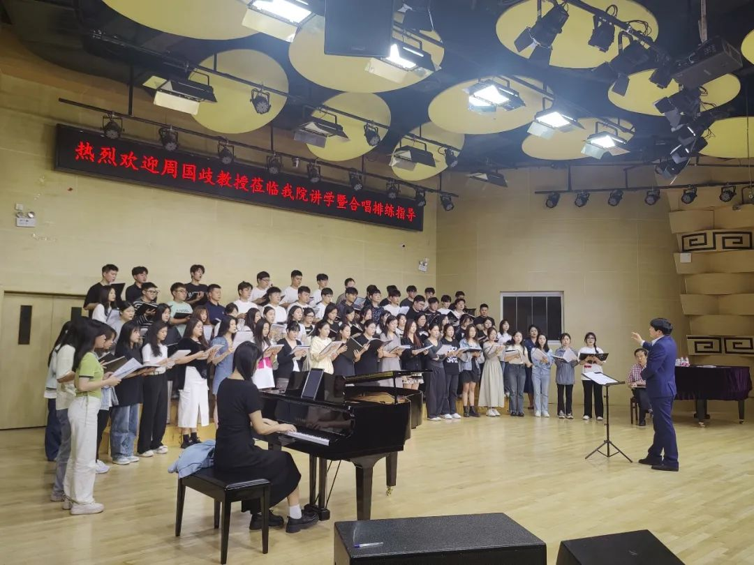 讲座结束后,在音乐厅排练现场,周国歧一方面为同学们从其作为创作者的角度上解读了《破陈子·醉里挑灯看剑》这一作品的细节,同时将讲座中的理论表达与实际演唱结合在一起,使参与排练的同学们对作品有了更深的理解,便于更完美、准确地演绎该作品,排练效果十分突出。